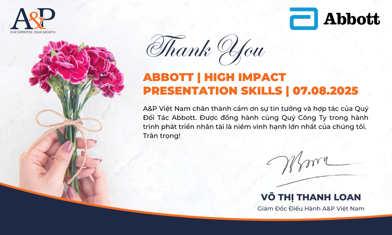 A&P Việt Nam gửi lời cảm ơn chân thành đến Abbott vì đã tin tưởng lựa chọn chúng tôi làm đối tác trong chương trình đào tạo này. Chúng tôi tin rằng những kỹ năng học viên nhận được từ khóa học sẽ tiếp tục đem lại giá trị bền vững, góp phần nâng cao hiệu quả làm việc và khả năng tạo ảnh hưởng trong tổ chức.