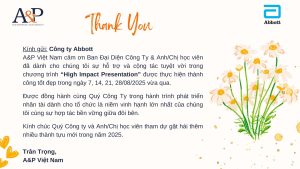 A&P Việt Nam gửi lời cảm ơn chân thành đến Abbott vì đã tin tưởng lựa chọn chúng tôi làm đối tác trong chương trình đào tạo này. Chúng tôi tin rằng những kỹ năng học viên nhận được từ khóa học sẽ tiếp tục đem lại giá trị bền vững, góp phần nâng cao hiệu quả làm việc và khả năng tạo ảnh hưởng trong tổ chức.