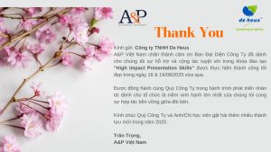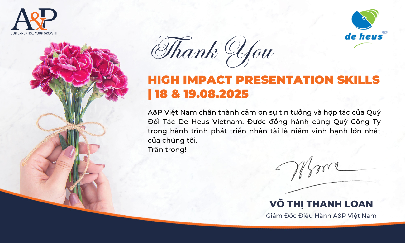 A&P Việt Nam xin trân trọng cảm ơn De Heus Việt Nam vì sự tin tưởng và hợp tác bền vững trong suốt thời gian qua. Chúng tôi rất vinh dự được đồng hành cùng Quý Công ty trong hành trình nâng cao năng lực đội ngũ và tin rằng chương trình lần này sẽ tiếp tục mang lại nhiều giá trị thiết thực cho các học viên.