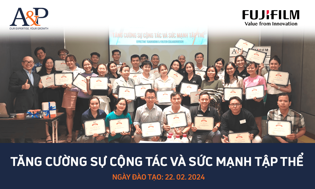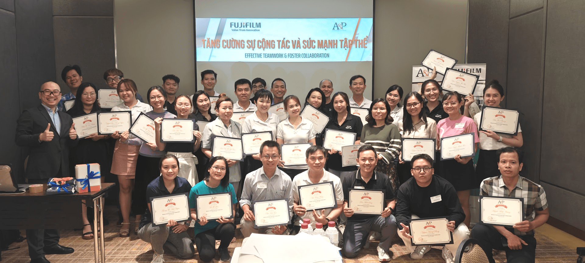 A&P Việt Nam rất vinh hạnh khi được đồng hành cùng Quý đối tác Fujifilm Vietnam qua chương trình Effective Teamwork and Foster Collaboration (Tăng cường sự cộng tác và sức mạnh tập thể). Khóa học được tổ chức thành công vào ngày 23.02.2024 vừa qua tại Thành phố Hồ Chí Minh.