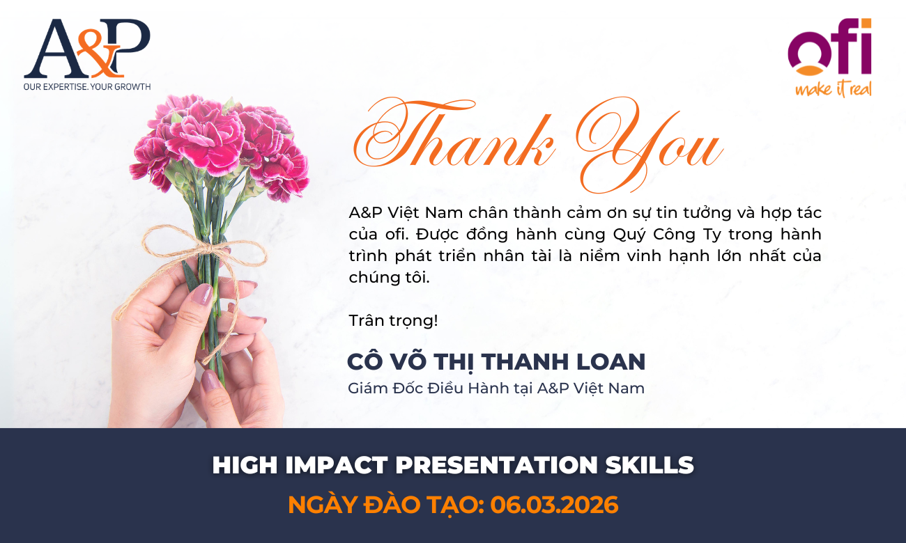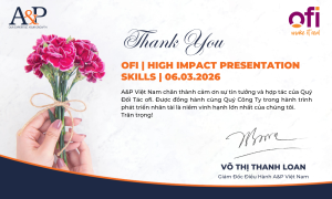 A&P Việt Nam xin gửi lời cảm ơn sâu sắc đến ofi Vietnam vì sự hợp tác tin tưởng và quý báu. Chúng tôi hy vọng rằng sẽ tiếp tục đồng hành cùng quý công ty trong những chương trình đào tạo sắp tới, góp phần nâng cao kỹ năng và phát triển toàn diện cho đội ngũ nhân sự của ofi Vietnam.